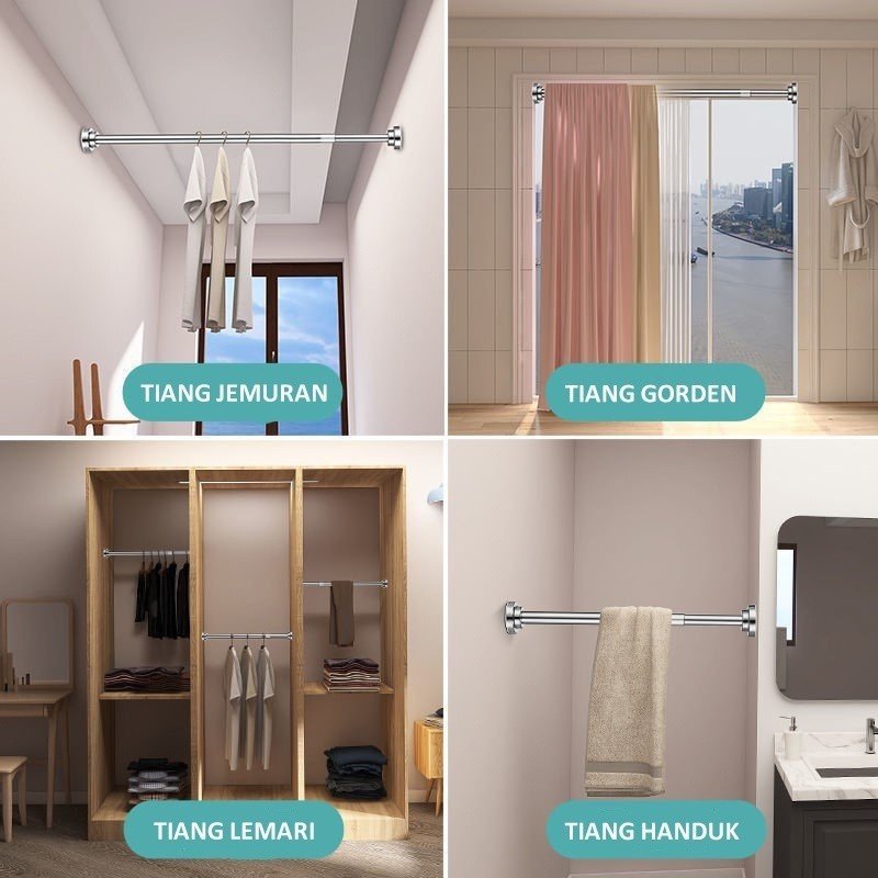 Tiang Jemuran Tempel Dinding Bahan Stainless Steel/ Tiang Gorden Batang Tirai Fleksible Tanpa Paku/ Gantungan Serbaguna Teleskopik Gantungan Baju